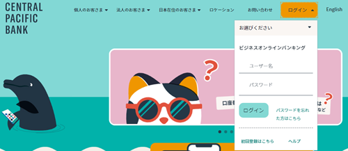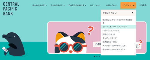 ①セントラルパシフィックバンクのウェブサイトから右上の「ログイン」ボタンをクリック