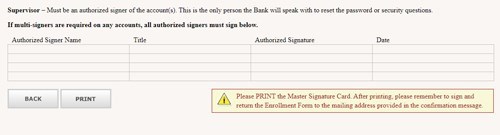印刷後、上記で入力した署名者の名前/タイトル(役職)/承認サイン(当行に登録のもの)/サインした日付(月-日-年の順)をそれぞれ 手書き でご記入ください。