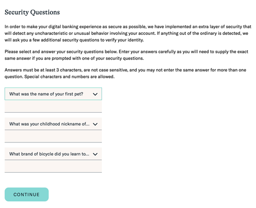 3つの質問と、それぞれの回答を入力したら、「CONTINUE」をクリックしてください。