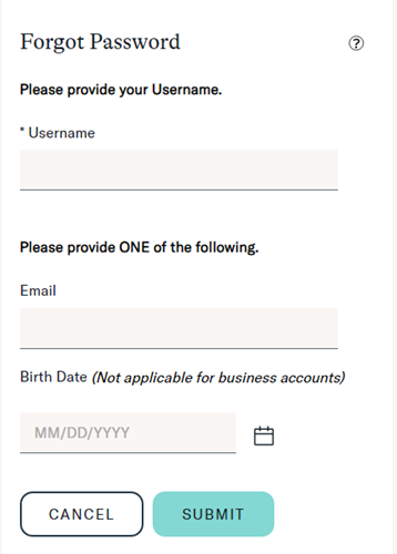 ④Username(登録時に入力されたユーザー名)、Email(メールアドレス)を入力。生年月日は空欄にしておいてください。入力後「SUBMIT」をクリック。