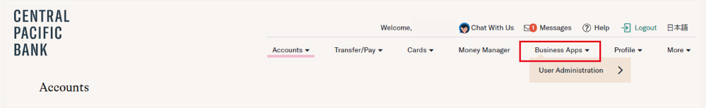 - ビジネスオンラインバンキングにログインし、ホーム画面の右上にある「Business Apps」をクリック