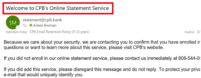 これで、eステートメントの設定は完了です。お疲れさまでした!なお今後は、最新のeステートメントが発行されるたびに、ご指定のメールアドレスに「Online Statement Notification」という件名で、英語のメッセージが届きます。
