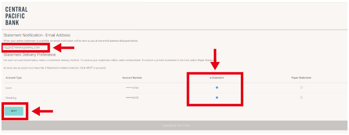 eステートメントが発行された際に、お知らせを受け取るメールアドレスが表示されています。アドレスが正しいかどうか確認してください。eステートメントは口座ごとの設定になるので、それぞれの口座で「e-Statement」を選択します。 そして、「NEXT」ボタンをクリックしてください。 - eステートメント確認画面が表示
