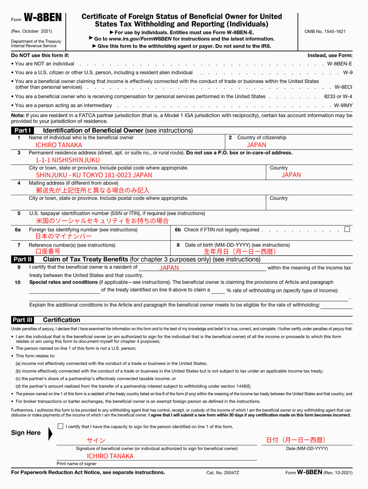 ※書面に関する詳細は、IRSのウェブサイトhttps://www.irs.gov/pub/irs-pdf/iw8ben.pdf からもご確認いただけます。