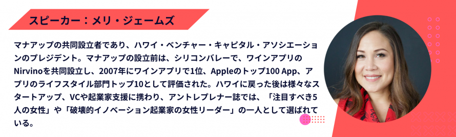 今回はそんなマナアップの創業者でもあり、今回のコロナ下でハワイのCPGビジネスに革新的な進化をもたらした立役者メリ・ジェームズ氏と、マナアップを金融面でお手伝いしているCentral Pacific Bankからヒーナン 希氏を迎え、地方CPGビジネスの事業拡大やイノベーションの在り方についてディスカションします。
