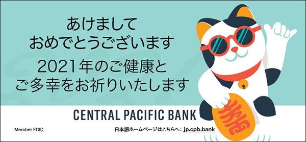 昨年は新型コロナの影響でハワイへの渡航を自粛されたお客さまも多いかと存じます。 日本とハワイ、遠隔のお取引を通じて当行へ変わらぬご愛顧を賜り厚く御礼申し上げます。 一日も早く皆様とハワイでお会いできますよう、また本年が明るい一年となりますよう、心よりお祈りいたします。 Hau’oli Makahiki Hou! Happy New Year!
